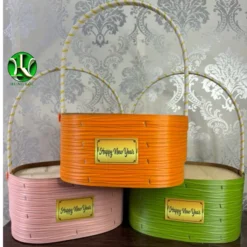Giỏ quà tết đế cao 15cm, quấn dây nhựa nhiều màu gắn thẻ Happy New Year màu vàng, giỏ trái cây, set yến.