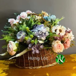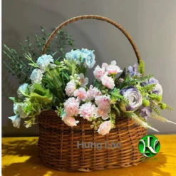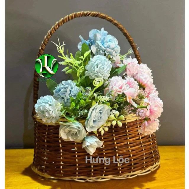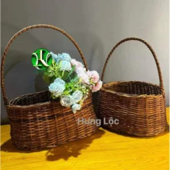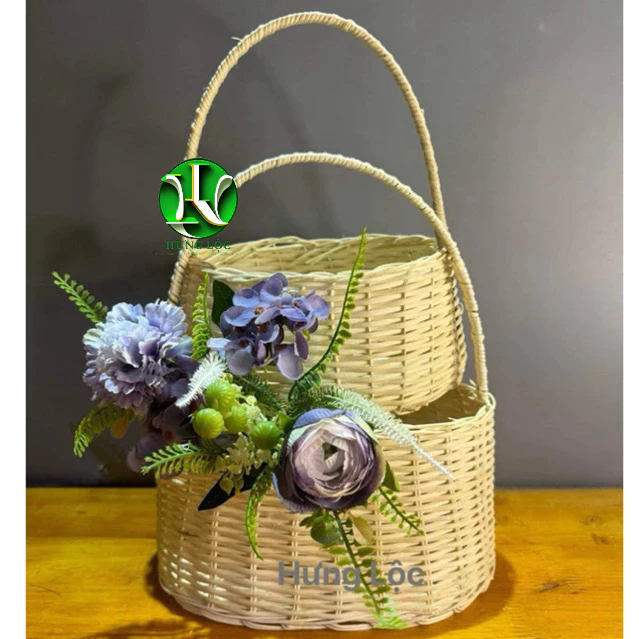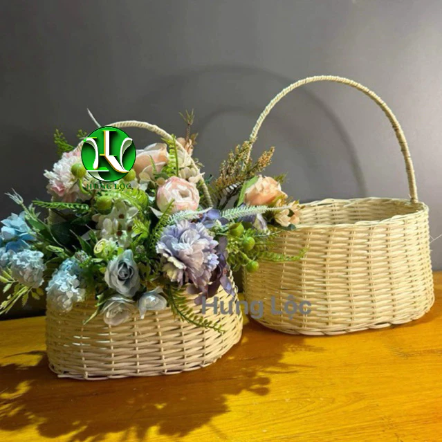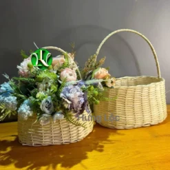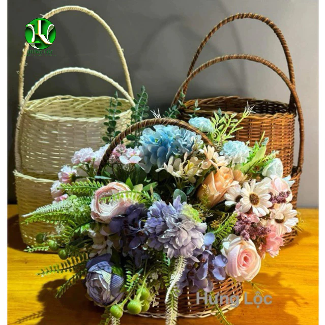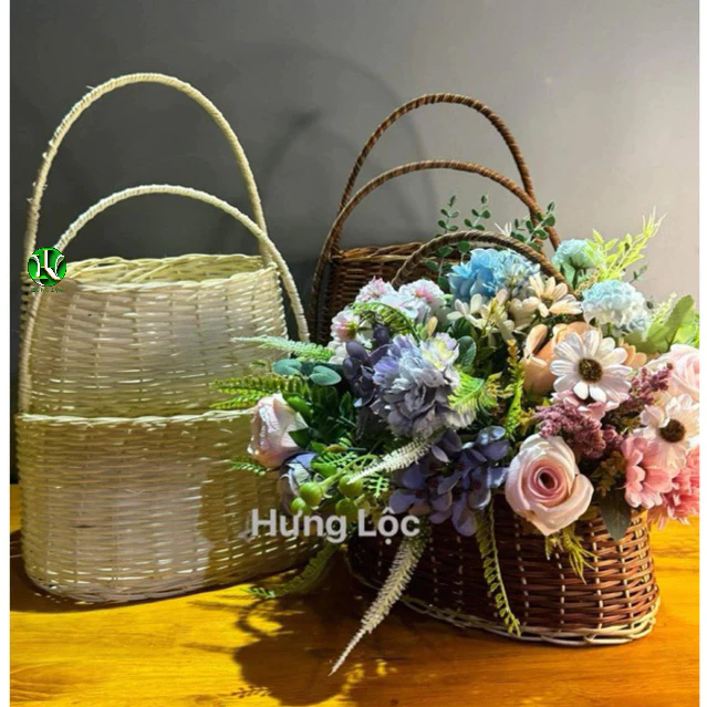 Giỏ mây cắm hoa dạng túi xách, màu trắng và màu nâu, cắm hoa tươi, hoa giả trang trí decor nhà cửa